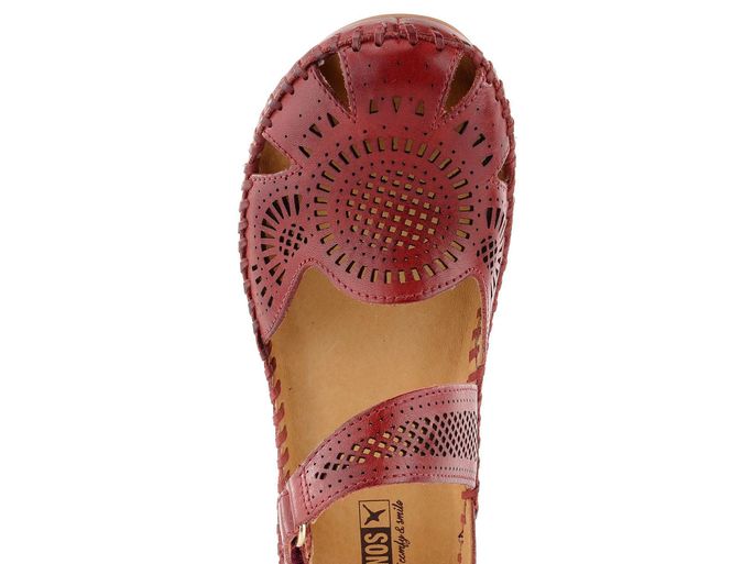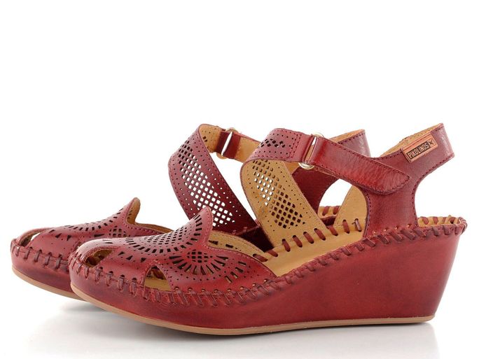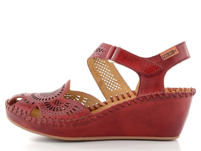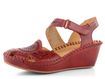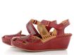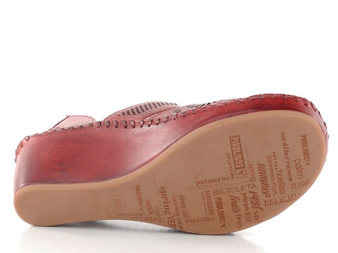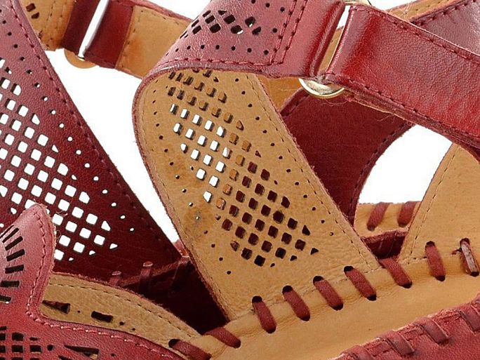 Dámské uzavřené sandály v červenovínové barvě s upínacím páskem na suchý zip a s potaženým klínkem.