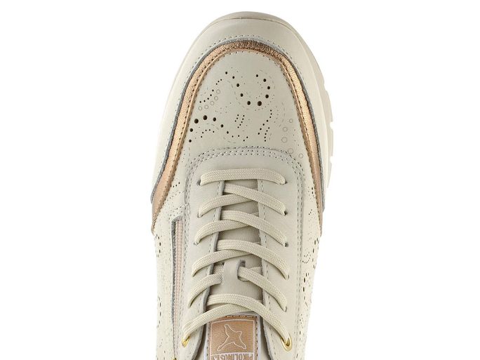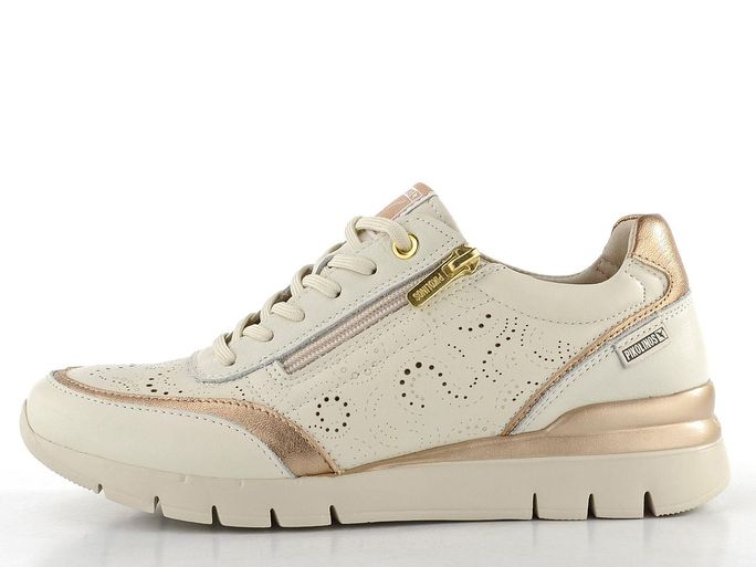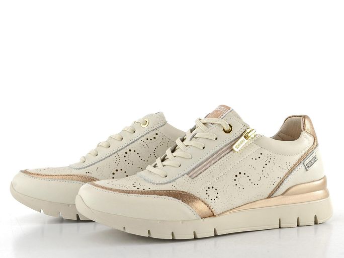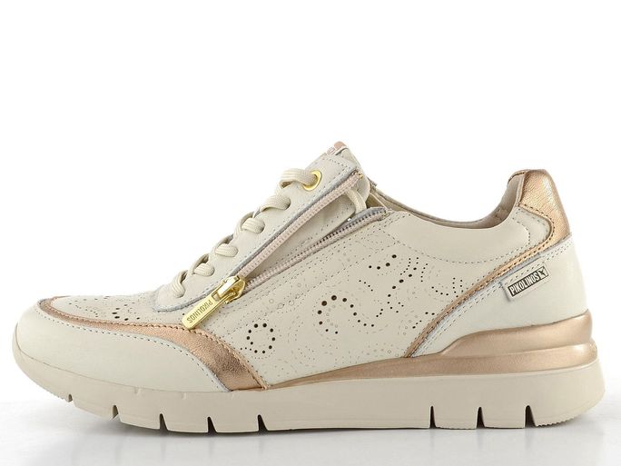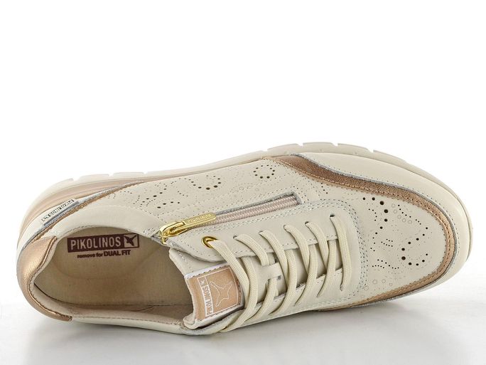 Dámské kožené polobotky od španělské značky Pikolinos kombinují eleganci a komfort, ideální pro městské prostředí. Jejich svršek z hladké kůže v krémové barvě s bronzovými metalickými doplňky nejen zaujme, ale také nabízí pohodlné nošení díky zipu podél šněrování. Jemný prořezávaný vzor zajišťuje příjemné odvětrávání, zatímco vyjímatelná měkká vložka s podporou nožní klenby přináší extra pohodlí. Technologie Dual FIT umožňuje nosit obuv i bez vložky pro větší vnitřní prostor. Lehké a flexibilní podešve s mírným klínkem dodávají botám moderní vzhled a funkčnost.