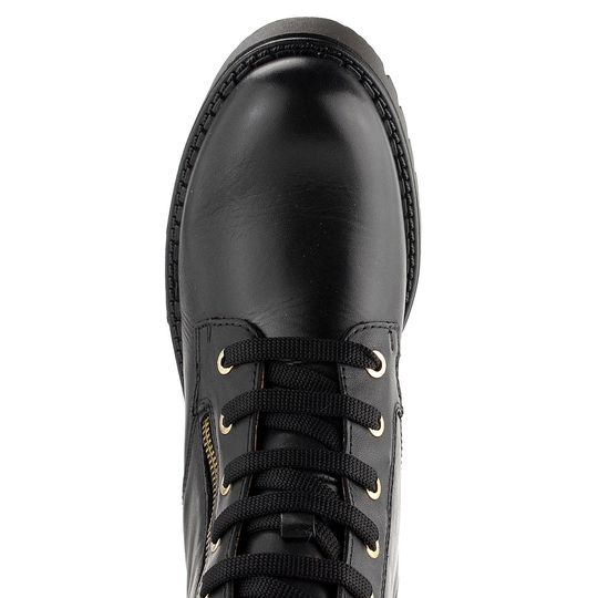 Boty mají pěknou kulatou špičku a klasické šněrování s plochými tkanicemi a kovovými očky, což umožňuje snadné přizpůsobení. Na vnější straně je funkční zip, který usnadňuje obutí. Textilní podšívka je mírně polstrovaná pro větší pohodlí, zatímco kožené vnitřní lemy a měkká stélka s koženým potahem zajišťují komfort při nošení.