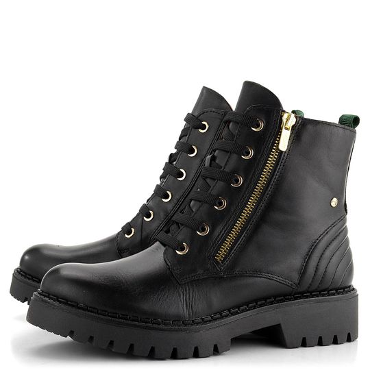 Elegantní a praktický dámský kotník od značky Pikolinos je ideální volbou pro podzimní a zimní sezónu. Tento model vyniká klasickou černou barvou s kovovými doplňky ve zlaté barvě, které dodávají botám sofistikovaný vzhled. Svršek je vyroben z kvalitní hladké kůže, což zaručuje dlouhou životnost a odolnost obuvi.