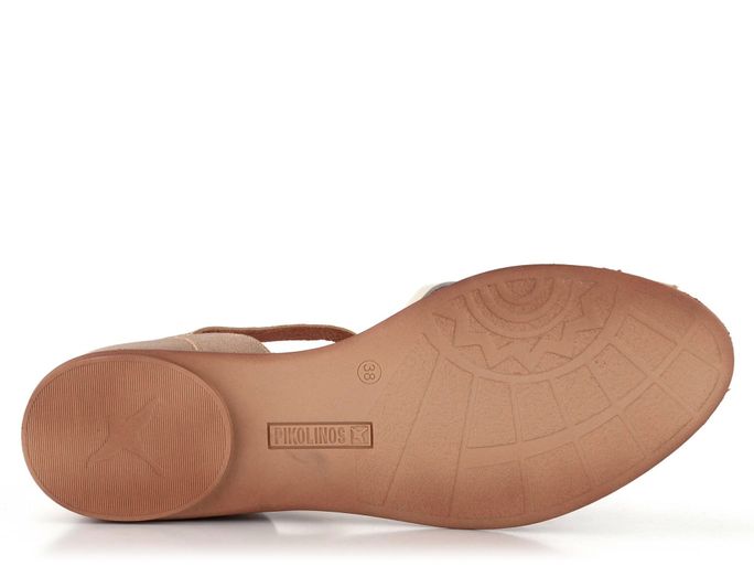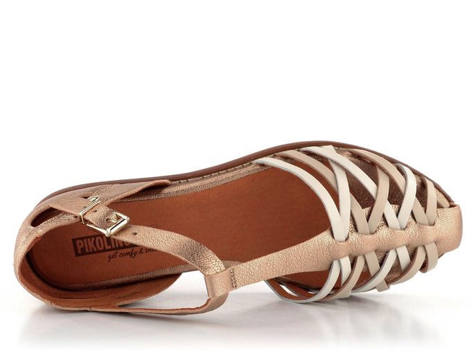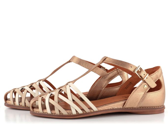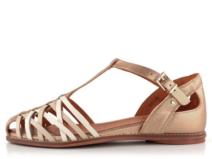 Dámské páskové sandály s plnou patou laděné do jemných béžových a růžově zlatých tónů.