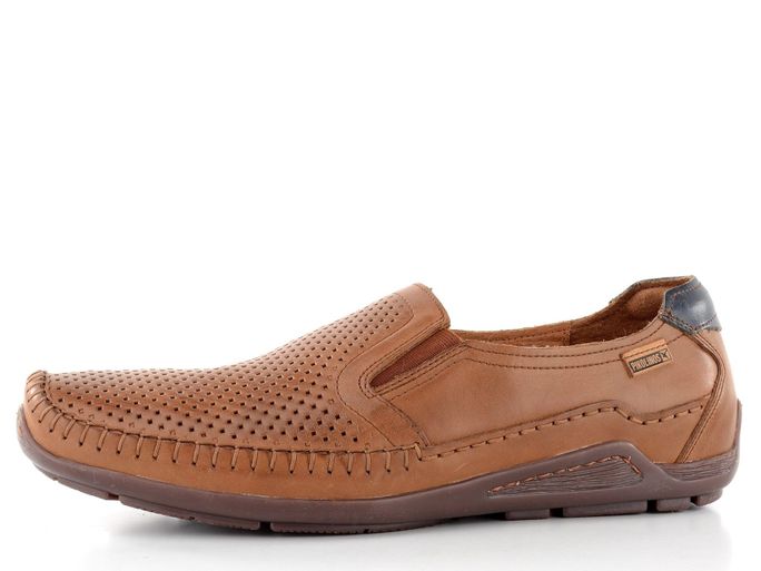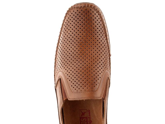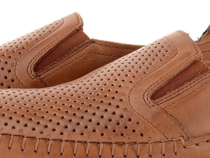 Pohodlné pánské kožené prozouvací polobotky v přírodní hnědé barvě s perforací a se dvěma pružinkami na nártu.
