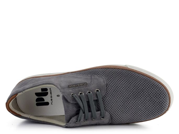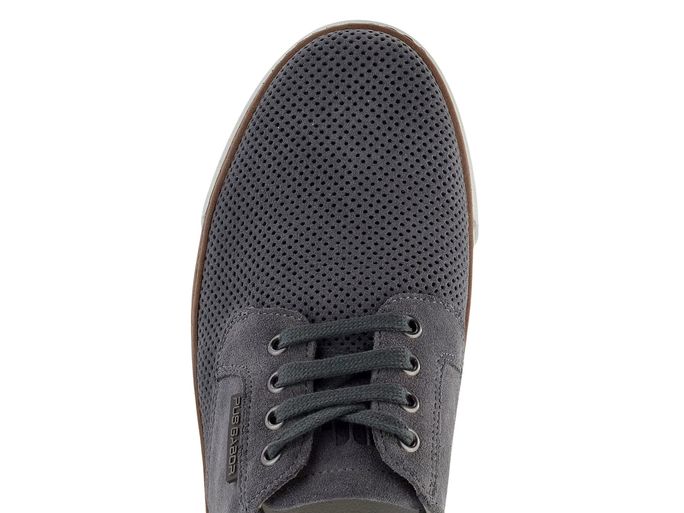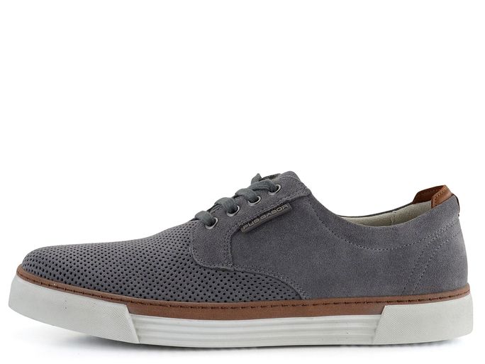 Ležérní model pánských šněrovacích semišových polobotek v šedé barvě s kontrastní latexovou podešví.