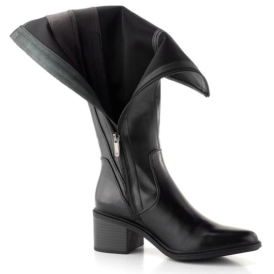 Dámské luxusní kozačky z jemné kůže s pružným lýtkem, teplejší podšívkou a pohodlným širokým podpatkem.