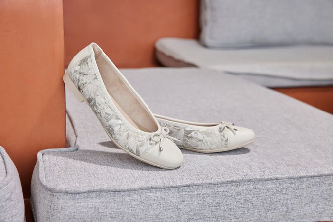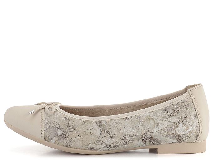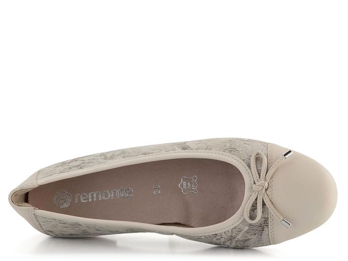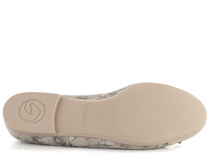 Komfortní dámské baleríny od značky Remonte jsou ideální volbou pro jarní a letní sezónu. Tyto boty vynikají jemným zpracováním a kombinací nubukové kůže a hladké syntetiky na špičce a patě. Barevné provedení v světle béžové barvě doplněné potiskem v šedé, stříbrné metalické a béžové barvě dodává balerínám elegantní vzhled.