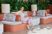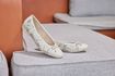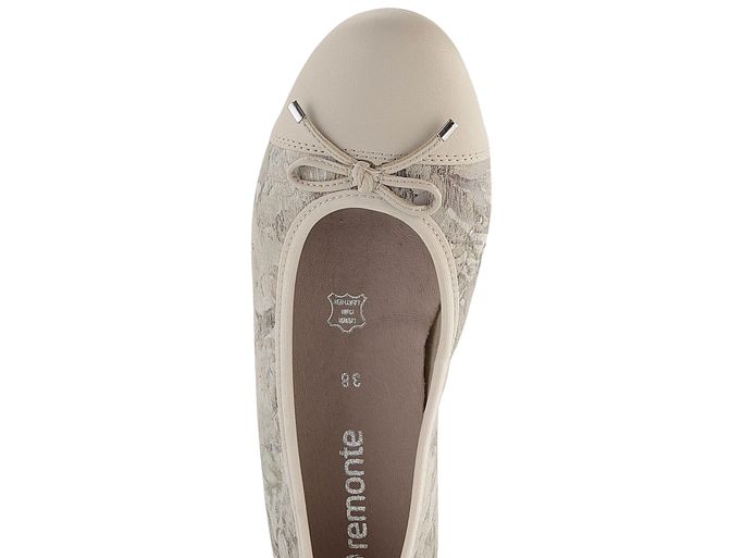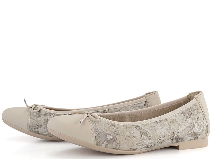 Dámské kožené baleríny ve světle béžové barvě s potiskem, decentní mašličkou a nízkým podpatečkem.