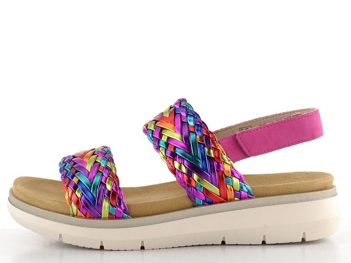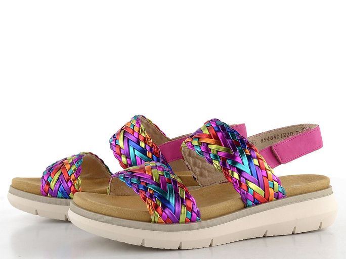 Zažijte jedinečný komfort a styl s těmito barevnými sandály na platformě od značky Remonte. Tento model z veganské kolekce je navržen s respektem k životnímu prostředí, což ocení každý, kdo dbá na udržitelnost. Sandály zaujmou svým metalickým a barevným provedením, které kombinuje fuchsiově růžovou, fialovou, červenou, oranžovou, tyrkysovou a žlutozelenou. Díky příjemně měkké a vyjímatelné vložce potažené broušenou textilií jsou tyto sandály ideální pro celodenní nošení. Patní pásek na suchý zip a pruženka na nártovém pásku zajišťují snadné a pohodlné upevnění. S vyšší podešví a malým klínkem o výšce 3,5 cm získáte nejen styl, ale i pohodlí.