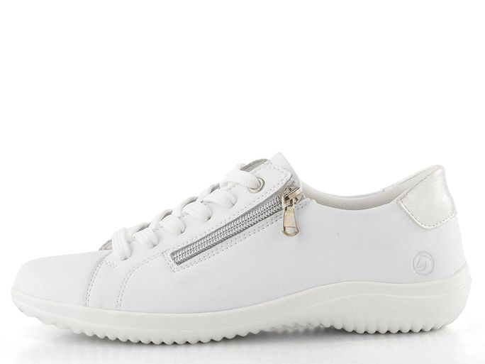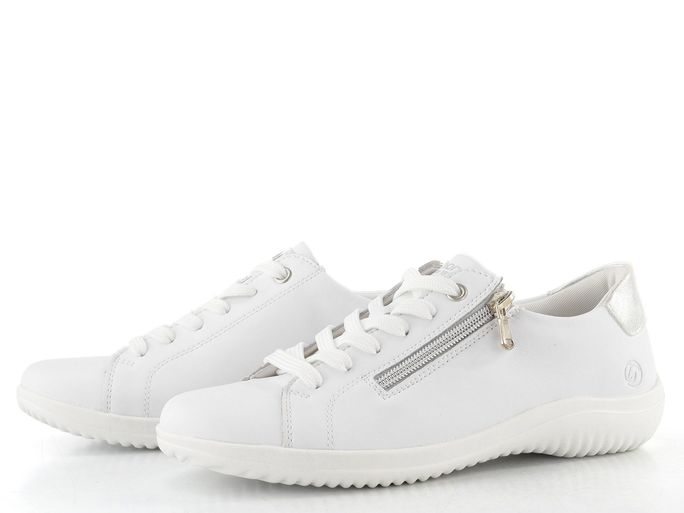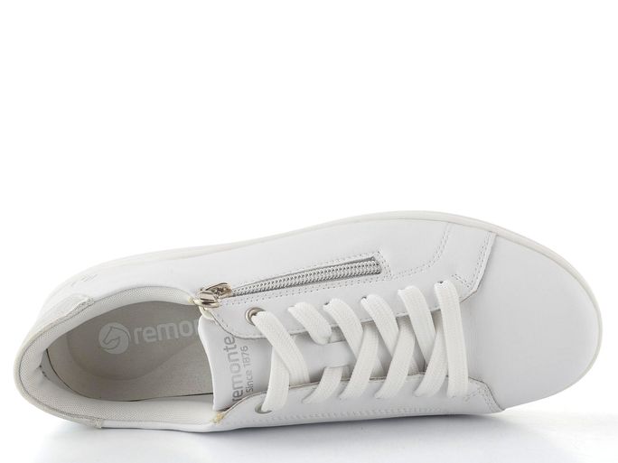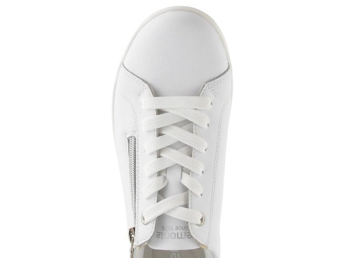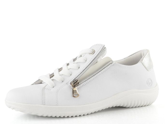 Pohodlí a styl se snoubí v těchto bílé polobotkách se zipem od značky Remonte. Jejich sportovnější střih s kulatou špičkou zajišťuje volnost pohybu, zatímco svršek z hladké povrstvené kůže dodává elegantní vzhled. Bílá barva je doplněna stříbrným metalickým detailem na patě, což z nich činí ideální volbu pro každou příležitost.