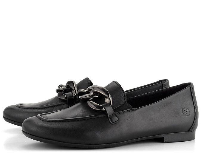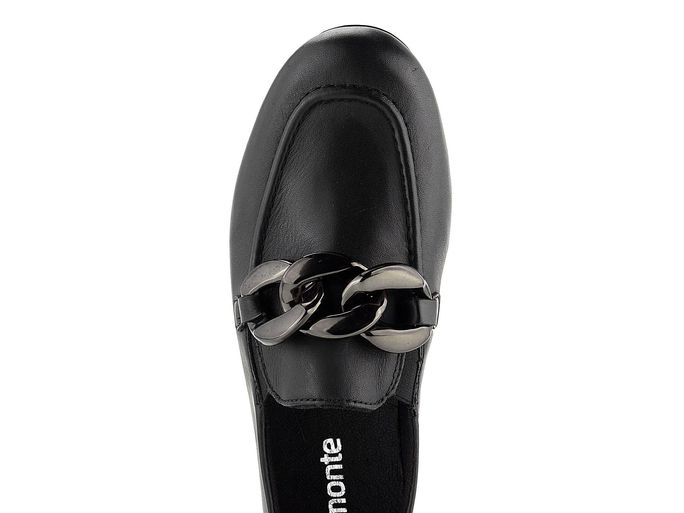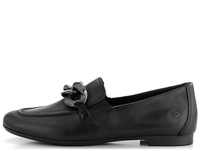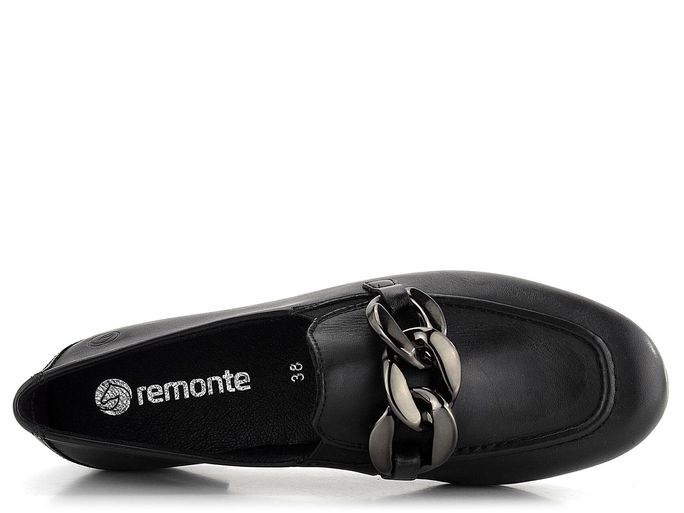Elegantní a komfortní dámské mokasíny v černé barvě od značky Remonte by Rieker jsou ideální volbou pro každodenní nošení. Mokasíny mají jednoduchý střih s kulatou špičkou a svršek z hladké kůže. Na nártu je zdobí plastový řetízek v kovově šedé barvě, který dodává botám moderní vzhled. Díky pruženkám na obou stranách nártu je obutí snadné a chůze příjemná. Mokasíny mají podšívku z broušené textilie a měkkou stélku potaženou hladkou kůží, což zajišťuje maximální pohodlí. Flexibilní latexová podešev s jemným vzorkem a nízkým, širokým podpatkem (1,3 cm) poskytuje stabilitu a komfort při chůzi. Tento model je vyroben lepeným způsobem, což zaručuje dlouhou životnost. Vyberte si kvalitu a styl s mokasíny od značky Remonte.