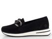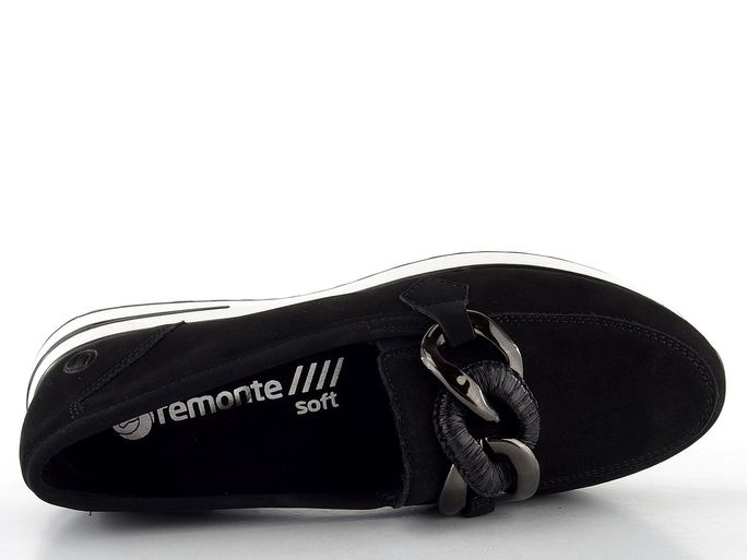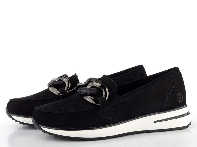Zažijte komfort a styl s dámskými mokasínami od značky Remonte. Tyto boty kombinují módní sportovní šmrnc s pohodlím, které oceníte při každodenním nošení. Svršek z nubukové kůže v elegantní černé barvě dodává botám sofistikovaný vzhled, zatímco výrazný plastový řetízek na nártu přidává moderní dotek. Pružné všité pruhy po stranách nártu usnadňují obutí a zajišťují pohodlné nošení. Boty jsou vybaveny vyjímatelnou stélkou s pěnovým základem, podporou podélné nožní klenby a patním absorbérem. Lehká sportovní podešev v kontrastní bílé barvě završuje design, který je ideální pro jarní a letní sezónu.