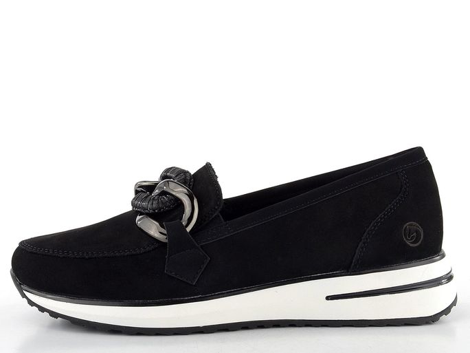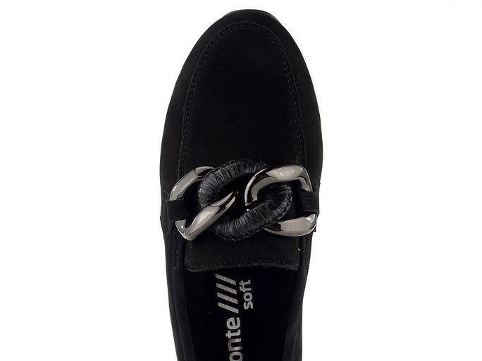 Nubukové dámské mokasíny v černé barvě s pohodlnou sportovní podešví a ozdobným řetízkem.