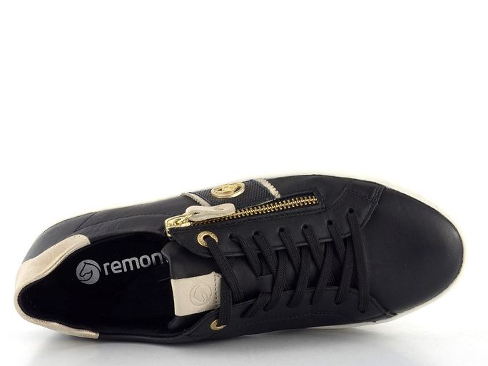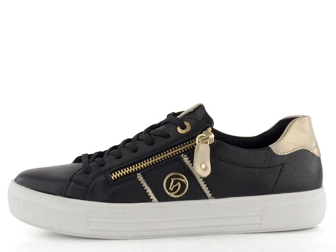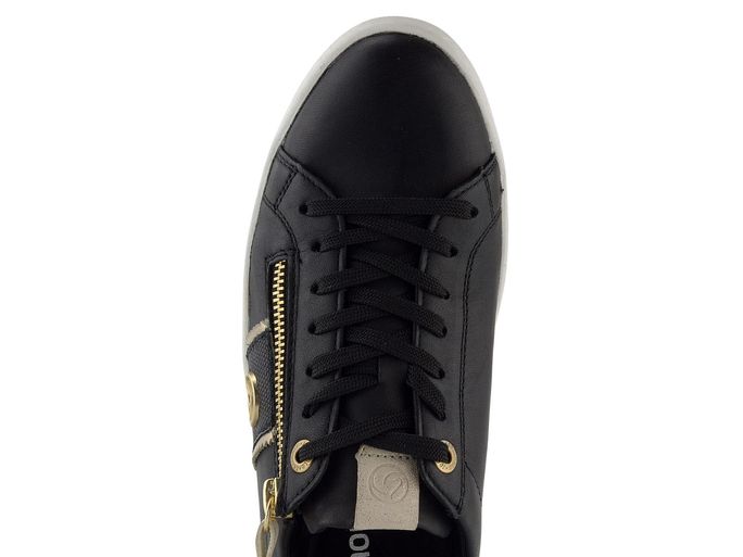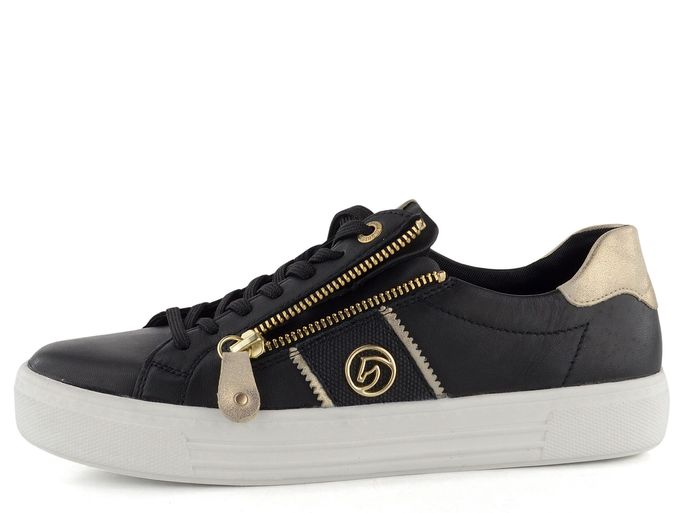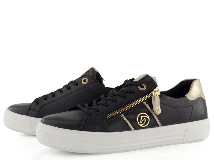 Stylové dámské tenisky značky Remonte, model D0919-03, spojují elegantní design s praktickými prvky. Tyto černé tenisky s metalickými detaily jsou vyrobeny z kvalitní hladké kůže, která zajišťuje nejen estetický vzhled, ale i dlouhou životnost. Funkční postranní zip usnadňuje obouvání, zatímco vyjímatelná pěnová stélka s podporou podélné nožní klenby a zesílenou patní zónou se postará o vaše pohodlí. Vnitřní textilní podšívka a měkčený obvodový lem zvyšují komfort při nošení. S rovnou syntetickou platformou a výškou podpatku 3,2 cm jsou ideální volbou pro každý den.