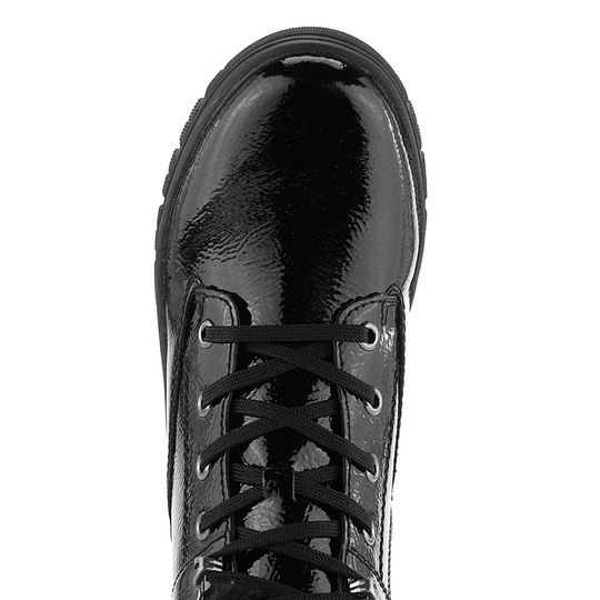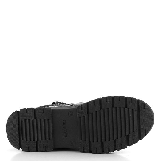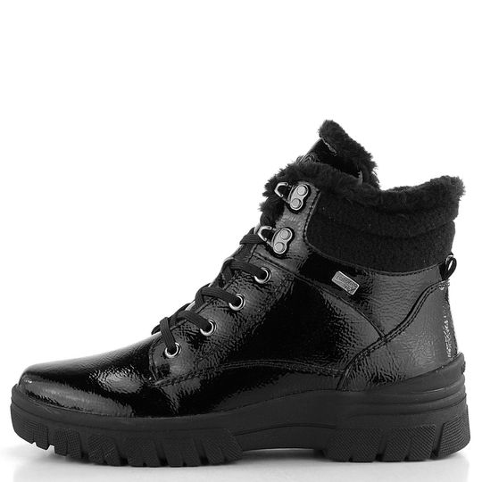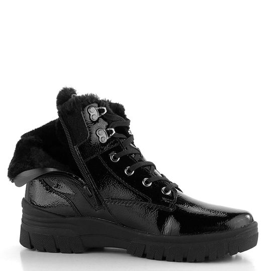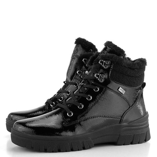 Dámský zimní kotník od značky Remonte by Rieker je ideální volbou pro chladné podzimní a zimní dny. Tento model kombinuje lakovanou kůži s textilní bandáží a hebkým lemem z kožešinky, což zajišťuje nejen stylový vzhled, ale i vysoký komfort. Prostorný střih s kulatou špičkou a šněrování s kovovými očky a háčky v ocelově šedé barvě přináší pohodlí a snadné obouvání. Díky postrannímu zipu je obouvání ještě jednodušší. Vnitřní podšívka a stélka z pravé ovčí vlny s pěnovým jádrem a termoizolační fólií poskytují výjimečné teplo. Funkční vodoodpudivá membrána remonteTEX® chrání před vlhkostí. Vyšší latexová podešev s hrubším protismykovým vzorkem zajišťuje stabilitu na kluzkém povrchu. Výška kotníku je 11 cm (bez podešve) a podpatek má výšku 5 cm. Tento model je lepený, což zaručuje odolnost a dlouhou životnost.