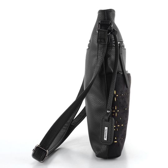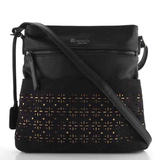 Praktická dámská crossbody kabelka značky Remonte by Rieker je ideální volbou pro podzimní a zimní sezónu. Tato menší kabelka je vyrobena ze strukturované syntetiky a textílie v elegantní černé barvě. Přední strana je zdobena laserem propalovanou textilií se zlatým podkladem a tmavě stříbrným kováním, což dodává kabelce jedinečný vzhled.