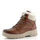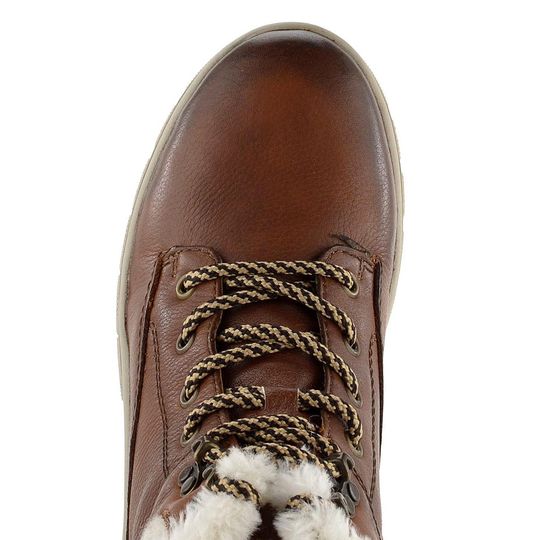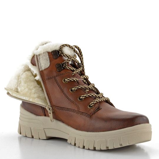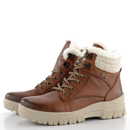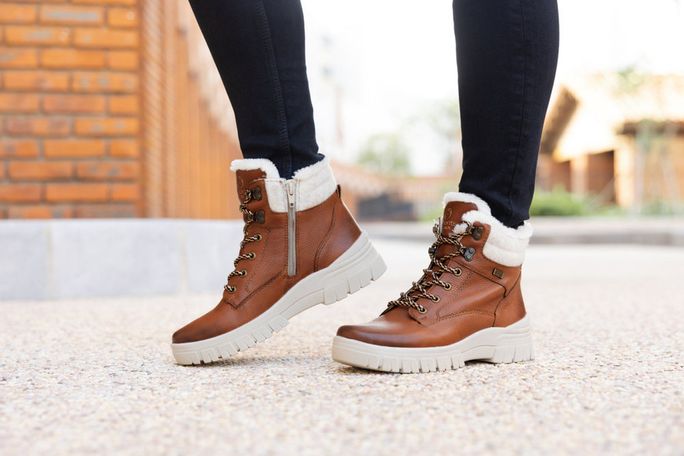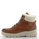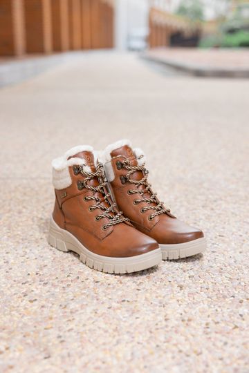 Dámský zimní kotník od značky Remonte je ideální volbou pro chladné podzimní a zimní dny. Tento model nabízí prostorný střih s kulatou špičkou a svršek z jemně strukturované kůže, doplněný textilní bandáží a lemem z hebké umělé kožešinky. Oříškově hnědá barva se stínováním na špičce a patě, spolu se světle béžovou bandáží, dodává botám elegantní vzhled.