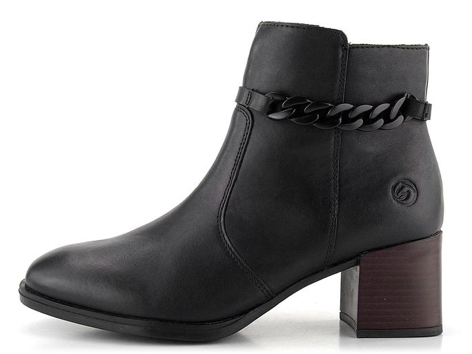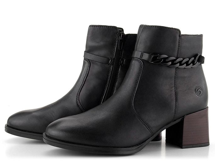 Dámská elegantní kotníčková obuv od značky Remonte je ideální volbou pro podzimní a zimní sezónu. Boty jsou vyrobeny z kvalitní hladké kůže v černé barvě, která dodává sofistikovaný vzhled. Díky širokému podpatku o výšce 6 cm poskytují stabilitu a pohodlí při chůzi. Vnitřní strana je vybavena zipem pro snadné obutí, zatímco vnější stranu zdobí stylový plastový řetízek.