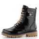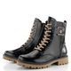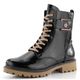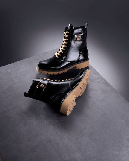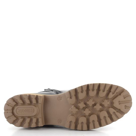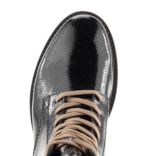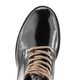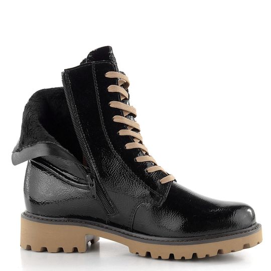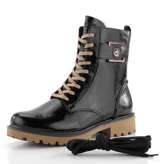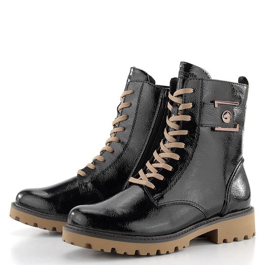 Komfortní dámské kotníkové boty od značky Remonte jsou ideální volbou pro podzimní a zimní sezónu. Vyrobené z jemně mačkané lakované kůže, která se přirozeně zvrásní v namáhaných místech, což není vada, ale typická vlastnost materiálu. Boty vynikají černou barvou a klasickým šněrováním, doplněným o postranní zip pro snadné obutí. Ozdobná kovová spona s logem na vnějším boku dodává botám elegantní vzhled. Teplejší vnitřní podšívka z hebkého textilního vlasu a filcová vyjímatelná stélka zajišťují maximální pohodlí. Lehká syntetická podešev s nízkým, širokým podpatkem (4 cm) a traktor vzorkem poskytuje stabilitu a komfort při chůzi. Výška kotníku je 17 cm (bez podpatku), což zajišťuje dostatečnou ochranu před chladem. Tyto boty jsou vyrobeny lepeným způsobem, což zaručuje jejich dlouhou životnost. Perfektní volba pro ženy, které hledají stylovou a pohodlnou obuv do města i kanceláře.
