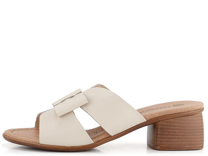 Elegantní a výrazné dámské pantofle od značky Remonte jsou módním doplňkem, který by ve vašem šatníku neměl chybět. Tyto pantofle s kulatým střihem a hladkým koženým svrškem v krémové barvě zaujmou na první pohled. Nárt zdobí stylová mašlička a nártový pásek je opatřen pruženkou pro optimální přizpůsobení. Vnitřní strana pásků je z broušené textilie, což zajišťuje pohodlí při nošení. Příjemně měkká stélka potažená hladkou kůží a pevnější syntetická podešev se širokým 5 cm podpatkem dodávají těmto pantoflím stabilitu a komfort. Tyto pantofle jsou ideální volbou pro jarní a letní sezónu a skvěle doplní váš outfit jak do města, tak na lehkou procházku.