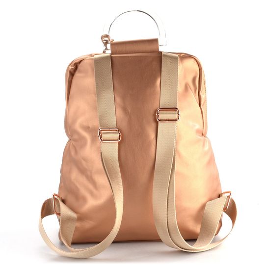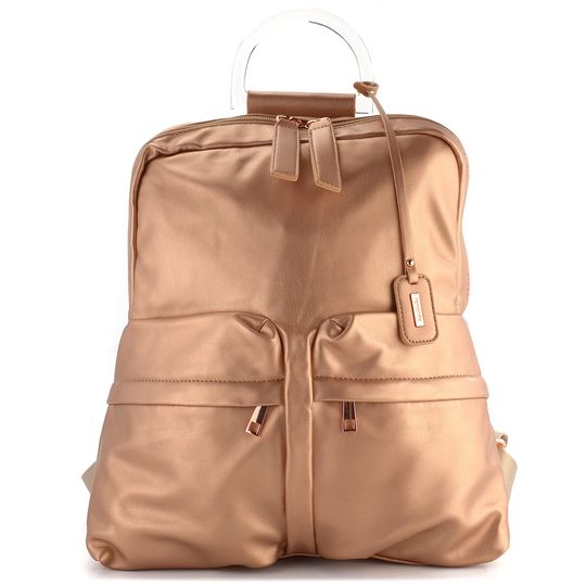 Městský stylový batoh v metalické růžové barvě se zajímavým transparentním poutkem a funkčními kapsičkami na přední straně.