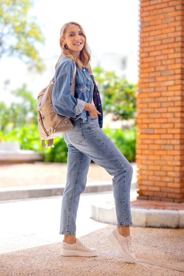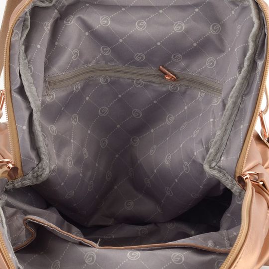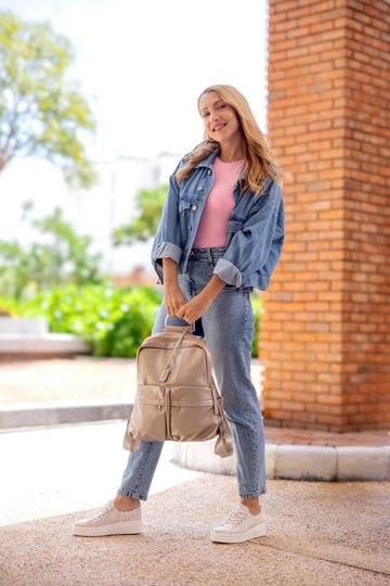 Praktické uspořádání zahrnuje dvě samostatné zipové kapsičky na přední straně a vnitřní vybavení s jednou zipovou kapsičkou na cennosti a dvěma otevřenými kapsičkami na mobil nebo klíče. Batoh se uzavírá dvoucestným zipem a nabízí textilní ramenní popruhy s možností délkové regulace. Plastové transparentní poutko na zavěšení dodává batohu moderní vzhled.