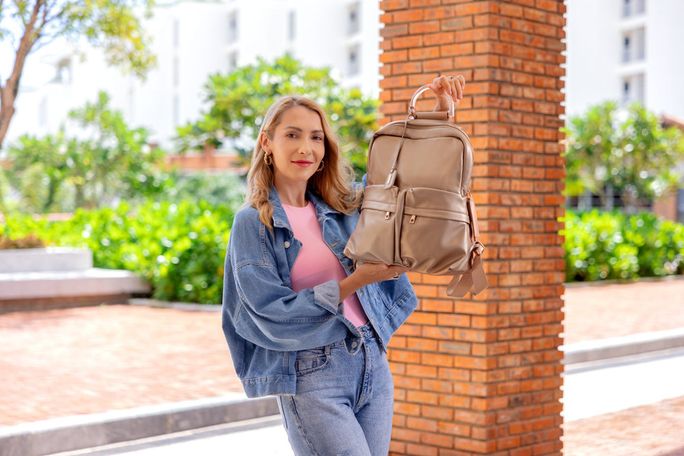 Rozměry: horní šířka 27 cm, spodní šířka 31 cm, výška 35 cm, hloubka dna 13 cm. Tento batoh je součástí kolekce jaro/léto 2024 a je dokonalým doplňkem pro každou moderní ženu, která hledá spojení stylu a funkčnosti.