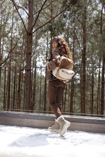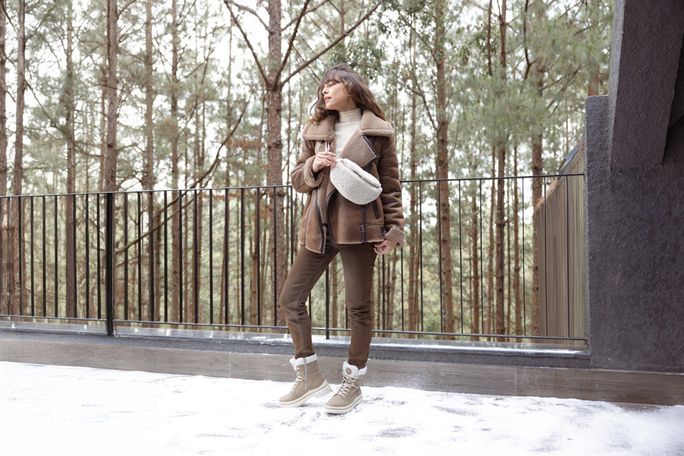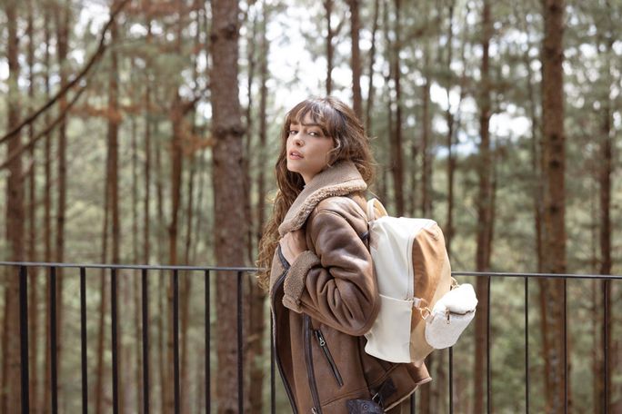 Svršek je vyroben z kombinace strukturované, matné a broušené syntetiky s beránkovou textilií, což zaručuje nejen atraktivní vzhled, ale i odolnost. Na přední straně najdete šikmou zipovou kapsu a odepínatelnou ledvinku, zatímco na zadní straně je praktická zipová kapsa a poutko na cestovní kufr.