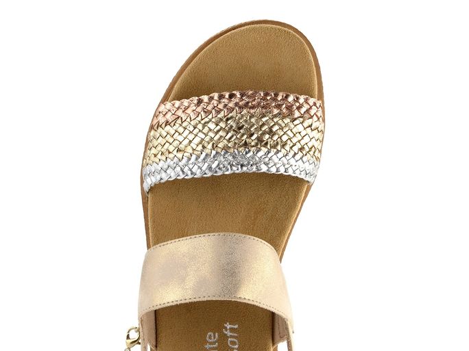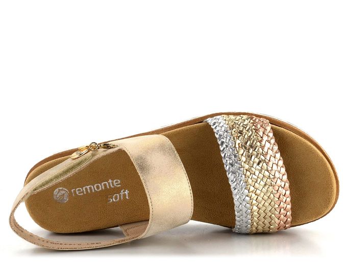 Velmi komfortní sandály v trendovém metalickém provedení od značky Remonte by Rieker jsou ideální volbou pro jarní a letní sezónu. Tento promo model časopisu ELLE se pyšní prostorným kulatým střihem a kombinací hladké kůže a matné syntetiky. Metalické provedení ve zlaté, stříbrné a bronzové barvě dodává sandálům moderní vzhled.