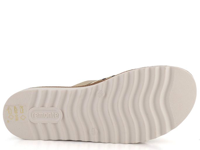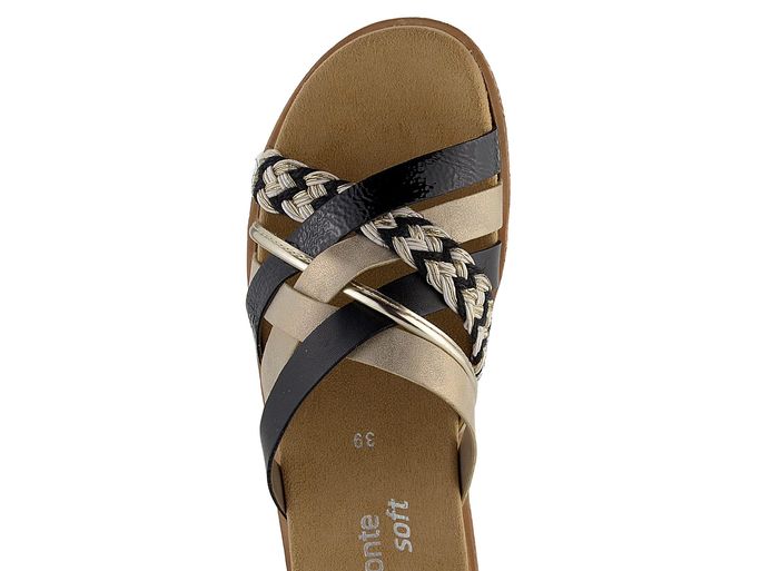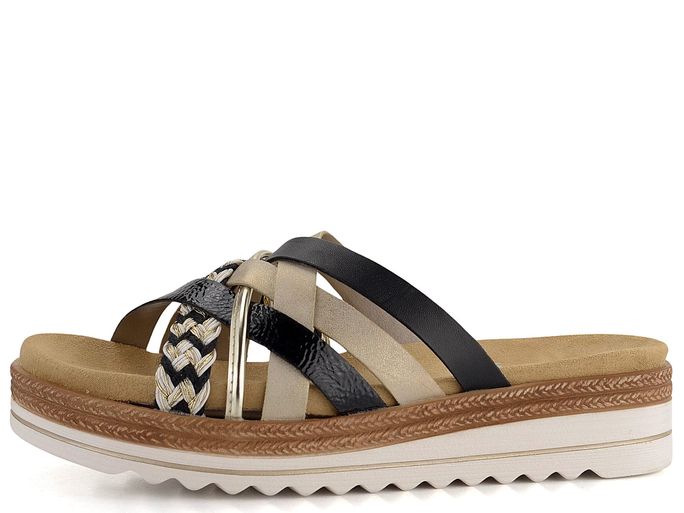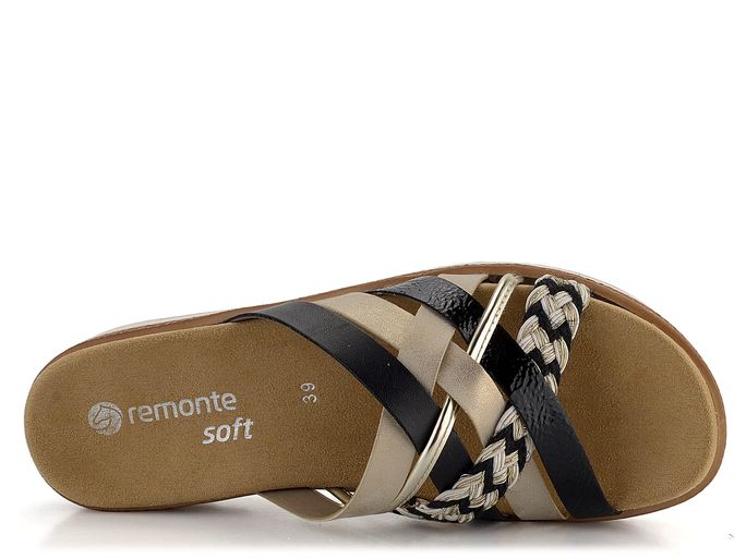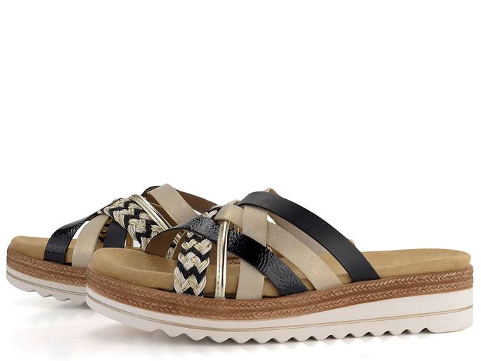 Elegantní dámské pantofle na platformě od značky Remonte kombinují moderní design a maximální pohodlí. Tyto pantofle z kolekce Lite’n Soft poskytují pocit chůze jako v oblacích. Jsou vyrobeny z hladké, lakované a metalické syntetiky, přičemž jeden z pásků je proplétaný jutou. Kombinace černé, zlaté platinové a bílé barvy dodává těmto pantoflím atraktivní vzhled.