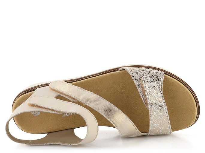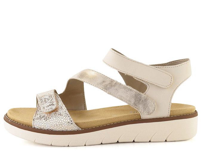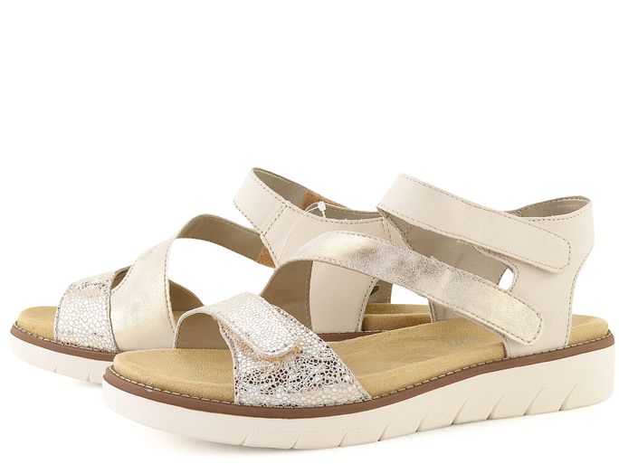 Elegantní a pohodlné páskové sandály pro ženy od značky Remonte jsou ideální volbou pro jarní a letní sezónu. Tyto sandály kombinují hladkou a metalickou kůži se syntetikou, což zajišťuje nejen stylový vzhled, ale i dlouhou životnost. Světle béžový odstín je doplněný jemnými zlatavo-bílo-šedými tóny, což z nich činí univerzální doplněk k jakémukoliv outfitu.