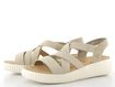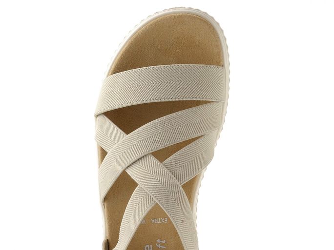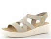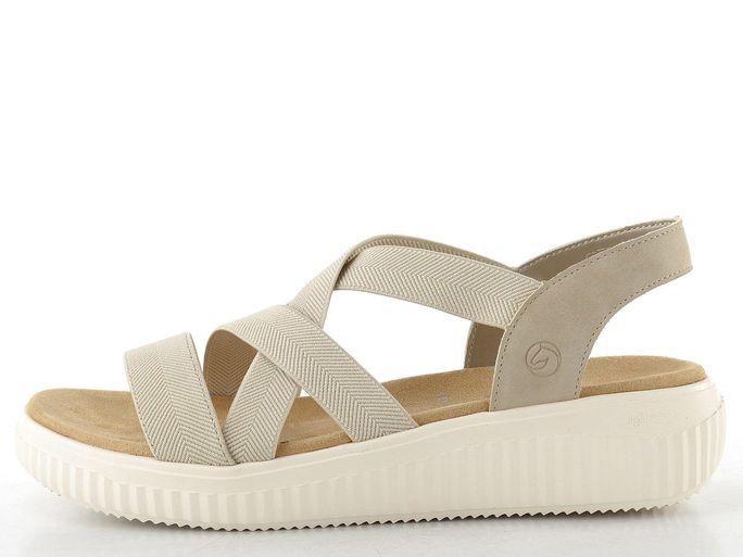 Svrchní materiál z matné syntetiky a pruženky v elegantní béžové barvě se skvěle hodí k různým outfitům. Všechny pásky kromě předního a patního jsou pružné, což zajišťuje snadné obouvání a pohodlí během nošení. Měkká a tvarovaná stélka potažená broušenou textilií poskytuje příjemný pocit při každém kroku.
