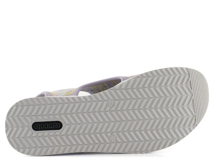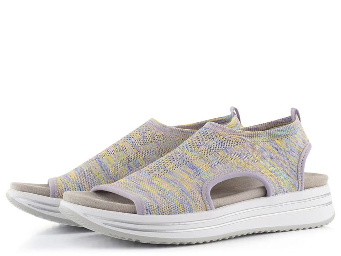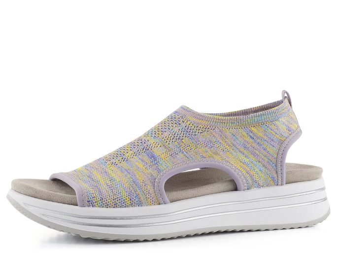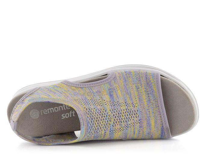 Pohodlí a styl se snoubí v těchto dámských sandálech od značky Remonte by Rieker. Ideální pro jarní a letní sezónu, tyto sandály zaujmou svým barevným žíhaným vzorem, kde převládají fialová, žlutá, růžová, modrá a zelená. Svršek z pružného a vzdušného úpletu bez podšívky zajišťuje maximální prodyšnost a pohodlí. Díky ponožkovému lemu se snadno obouvají bez potřeby zapínání. Vyjímatelná měkká textilní stélka, uchycená na suchý zip, poskytuje pohodlí i pro bosé chodidlo. Otevřená kulatá špička a vyšší podešev se stříbrnými proužky dodávají sandálům sportovní nádech. S výškou podpatku 3,5 cm jsou tyto sandály ideální volbou pro každodenní nošení.