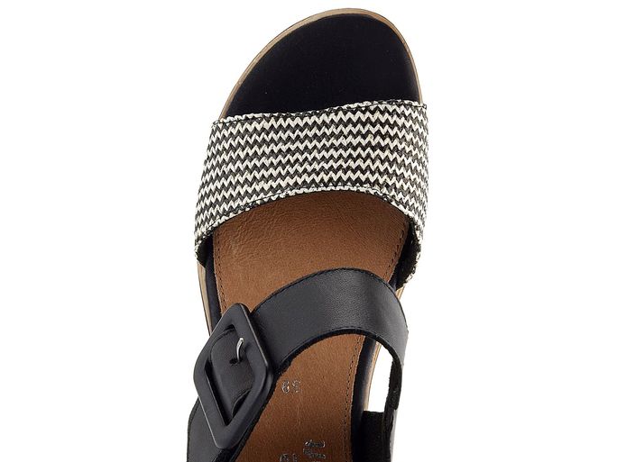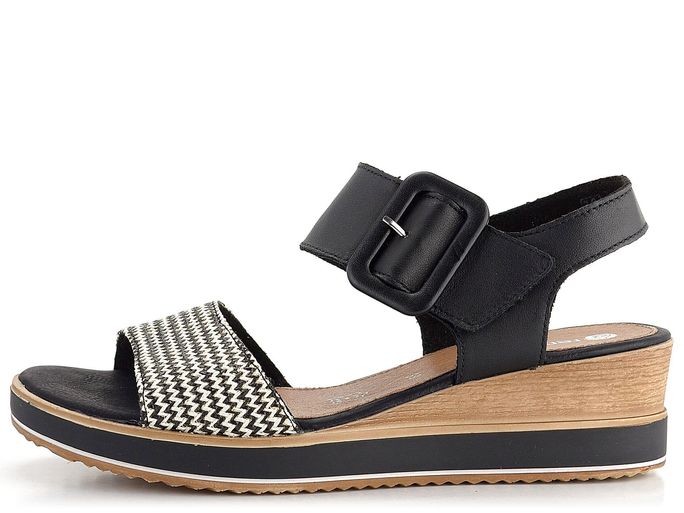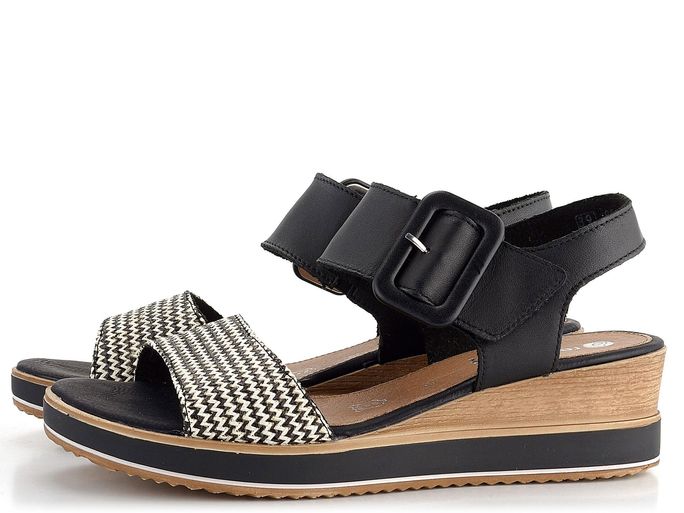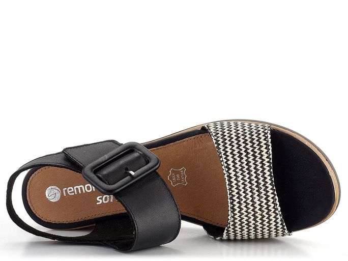 Hledáte pohodlné a stylové sandály pro nadcházející jaro a léto? Dámské sandály značky Remonte v černo-bílé kombinaci jsou ideální volbou. Tyto sandály se pyšní prostorným kulatým střihem a jsou vyrobeny z kvalitní hladké kůže, která je doplněna nártovým páskem ze splétaného lýka. Černá barva je elegantně doplněna černo-bílým vzorem na nártovém pásku.