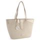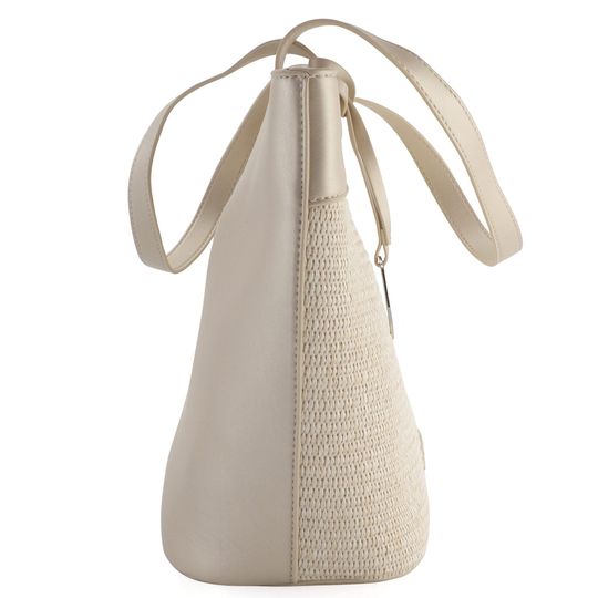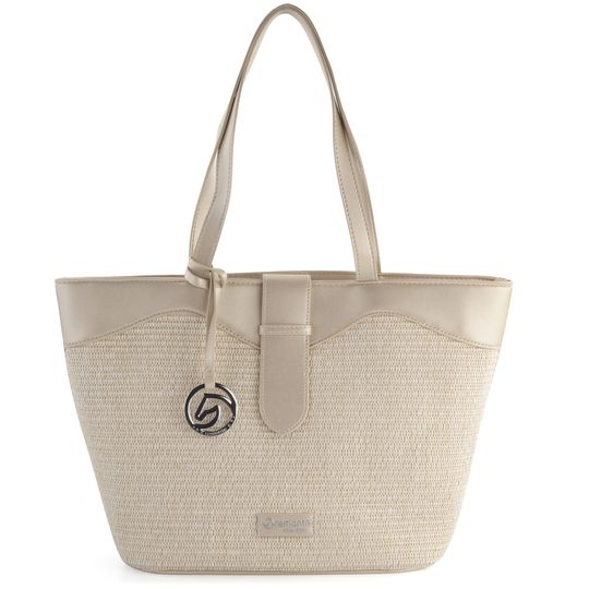 Elegantní dámská shopper kabelka ve světlých tónech od značky Remonte je ideálním doplňkem pro jarní a letní sezónu. Tato prostorná kabelka pohodlně pojme formát A4 a je vyrobena z hladké a poddajné syntetiky v perleťovém lesku v kombinaci s umělým lýkem. Přední strana kabelky je zdobena vzorem ze splétaného lýka, zatímco zadní strana nabízí pohotovostní zipovou kapsičku. Kabelka je opatřena odnímatelným kovovým přívěškem s logem značky ve stříbrné barvě. Vnitřní výbava zahrnuje jednu zipovou kapsičku a dvě otevřené kapsičky na mobil či klíče. Červená bavlněná podšívka dodává kabelce nádech luxusu. Pevná madla umožňují pohodlné nošení v ruce nebo přes rameno. Rozměry: horní šíře 44 cm, spodní šíře 30 cm, výška 28 cm, hloubka dna 15 cm.