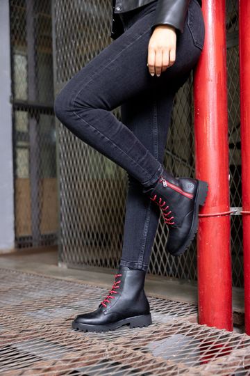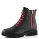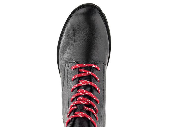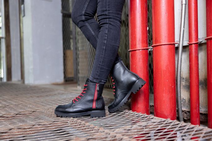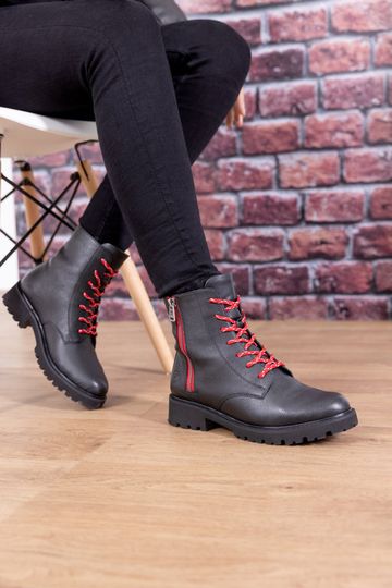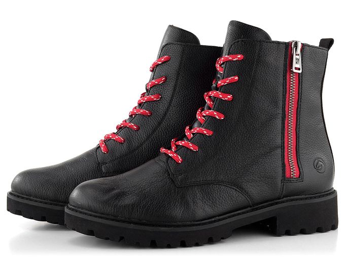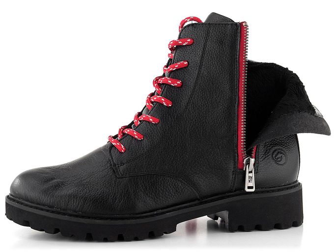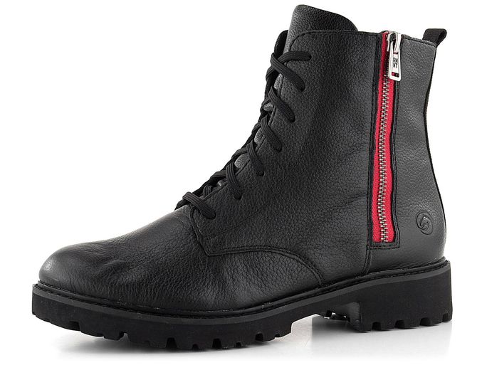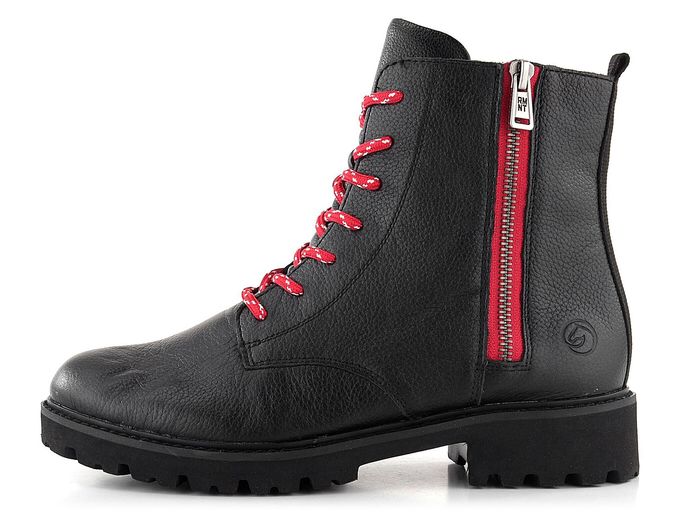 Stylový kotníkový model od značky Remonte by Rieker je ideální volbou pro podzimní a zimní sezónu. Tyto boty zaujmou svým černým svrškem z hladké kůže s jemnou strukturou, který je doplněn o výrazné červené prvky. Šněrování nabízí dvojí sadu tkaniček - kulaté červené a ploché černé, což vám umožní přizpůsobit vzhled podle nálady. Funkční červený zip na vnější straně usnadňuje obouvání.