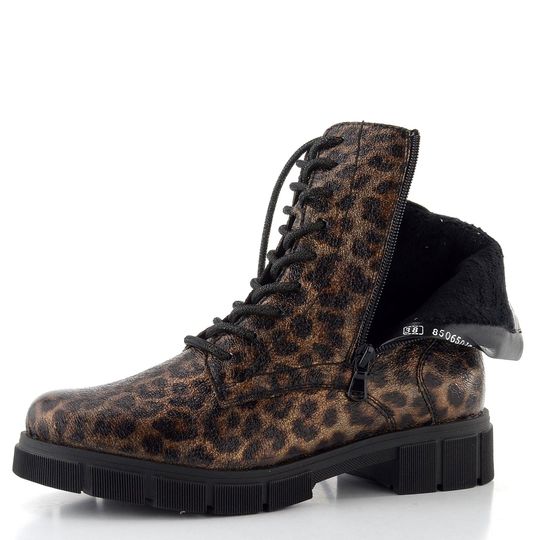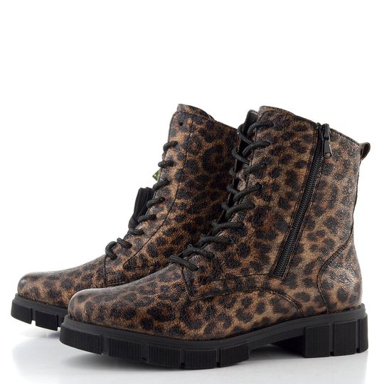 Stylový dámský zimní kotník od značky Remonte by Rieker je ideální volbou pro podzimní a zimní dny. Tento 100% vegan model se pyšní metalickým leopardím vzorem, který zaujme na první pohled. Svršek z jemně mačkané syntetiky a kulatá špička zajišťují nejen atraktivní vzhled, ale i pohodlí. Funkční zip na vnější straně usnadňuje obutí, zatímco mírně teplá podšívka z hebké textilie poskytuje příjemný komfort.