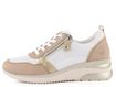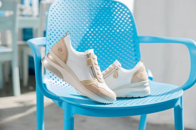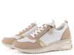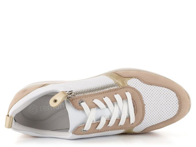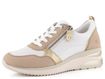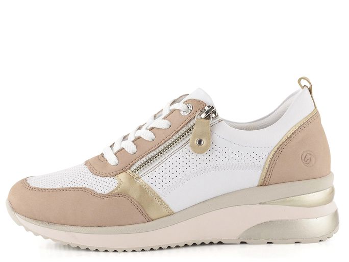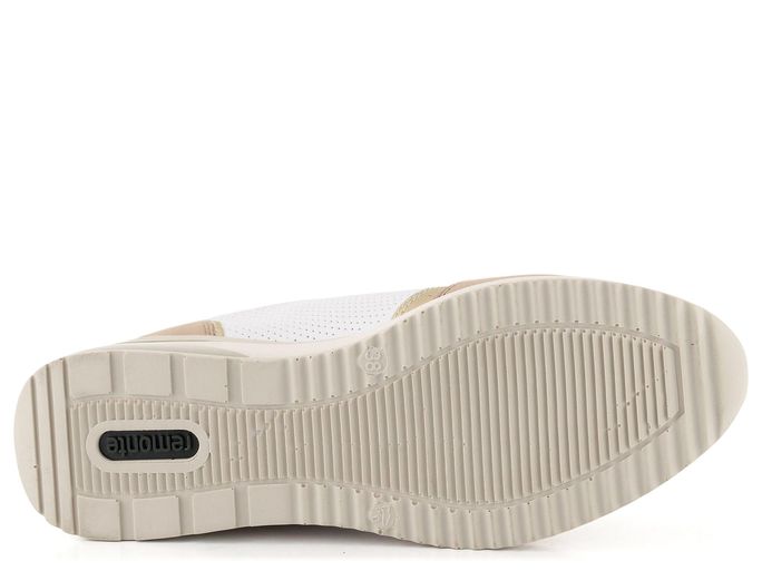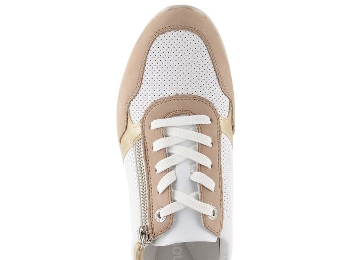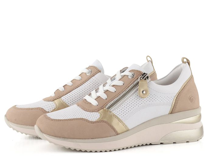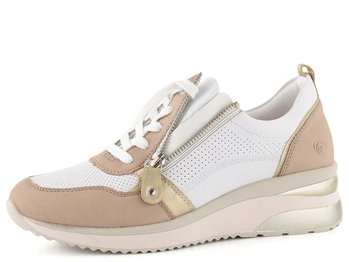 Velmi pohodlné tenisky na klínku v elegantní béžovo-bílé kombinaci od značky Remonte jsou ideální volbou pro každodenní nošení. Jejich sportovnější střih a svršek z jemné nubukové kůže a hladké kůže se zátěrem zajišťují nejen stylový vzhled, ale i dlouhou životnost. Bílý základ je doplněný béžovou a zlatou metalickou barvou, což dodává teniskám moderní nádech.