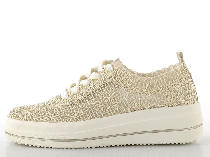 Vnitřní prostor je bez podšívky, což přispívá k lehkosti, a vyjímatelná vložka s patním absorbérem a podporou nožní klenby se postará o maximální komfort. Vysoká a lehká platforma dodává teniskám šmrnc, zatímco béžová barva s metalickými doplňky se snadno kombinuje s různými outfity. Tyto tenisky jsou ideální volbou pro každodenní nošení, ať už do města nebo na lehkou procházku.