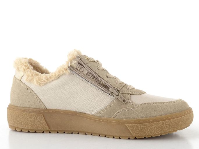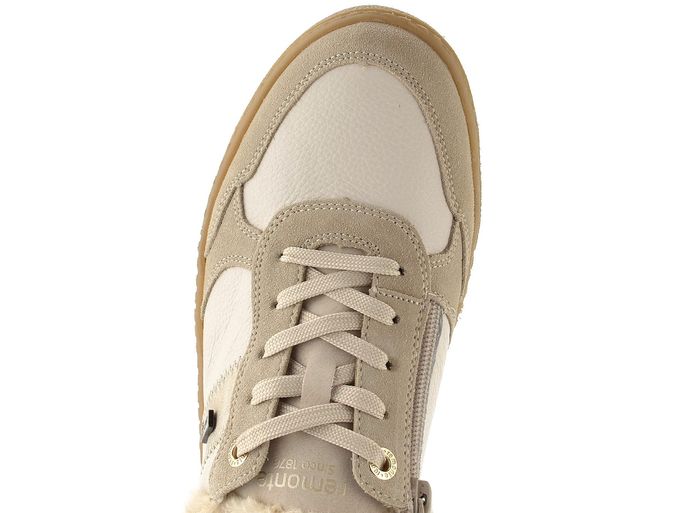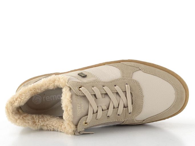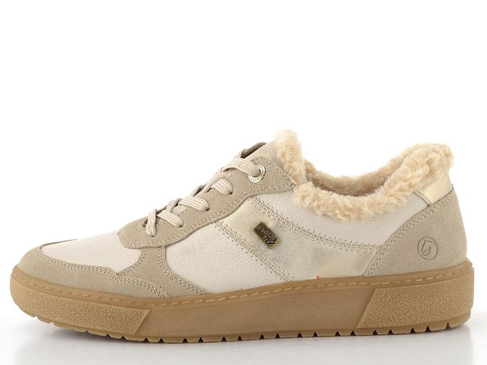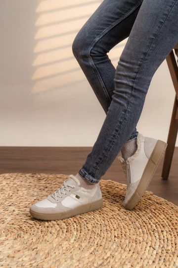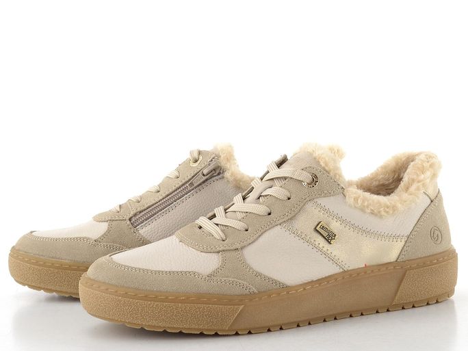 Krásné dámské tenisky od značky Remonte jsou ideálním společníkem pro chladnější podzimní a zimní dny. Tyto tenisky v béžové barvě kombinují strukturovanou a semišovou kůži s textilií, což zaručuje nejen styl, ale i pohodlí. Kulatý střih a obvodový lem z hebké kožešinky dodávají obuvi elegantní vzhled a komfort.