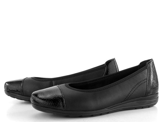 Dámské černé kožené baleríny v kulatém střihu s lakovanou špičkou a patou.