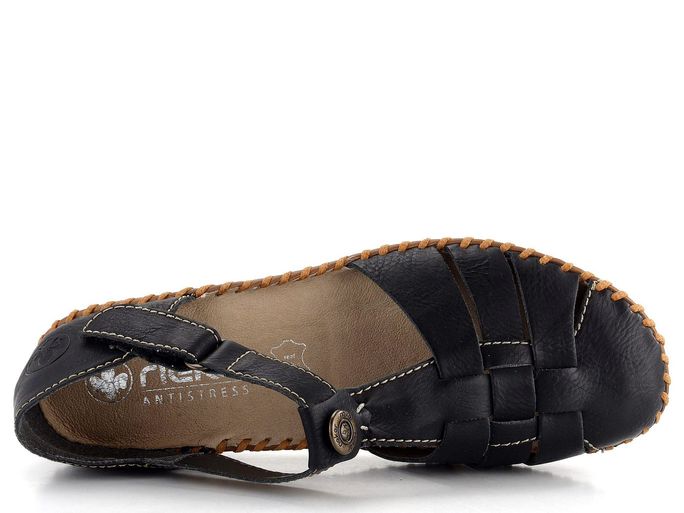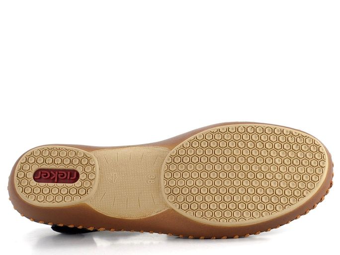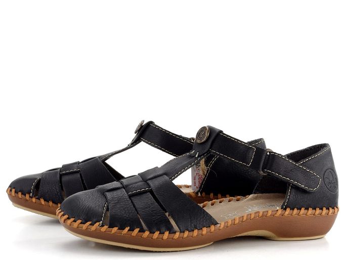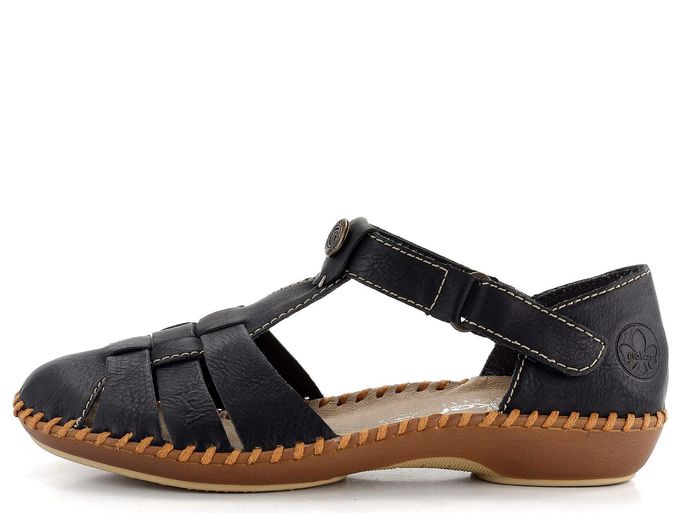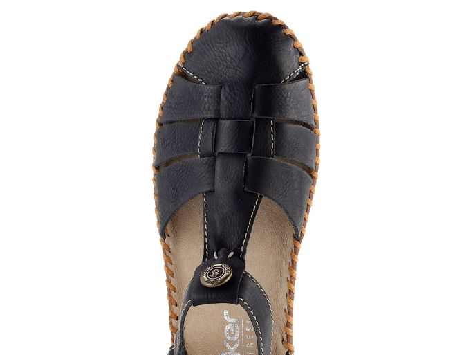 Dámské baleríny značky Rieker v elegantní černé barvě jsou ideální volbou pro každou příležitost. Jejich komfortní střih a kulatá špička zajišťují pohodlí po celý den. Svršek je vyroben z poddajné hladké syntetiky s jemnou strukturou, která je doplněna kontrastním světlým prošíváním. Nártový T pásek se zapíná na suchý zip, což usnadňuje obouvání.