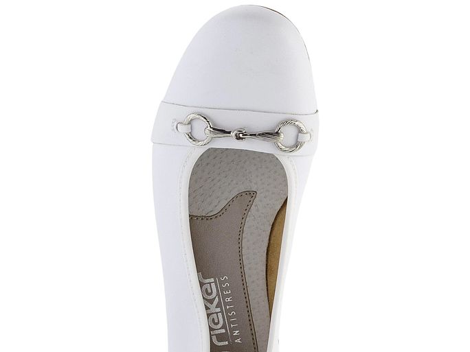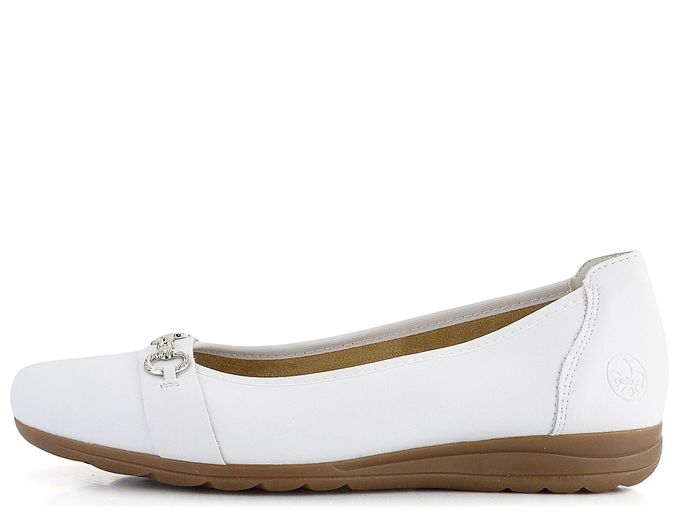 Stylové a pohodlné dámské baleríny značky Rieker v elegantní bílé barvě jsou ideální volbou pro jarní a letní sezónu. Tyto baleríny mají kulatou špičku a jsou vyrobeny z kombinace povrstvené kůže a syntetiky, což zajišťuje jejich odolnost a dlouhou životnost. Ozdobný pásek se stříbrným kováním dodává botám jedinečný vzhled.