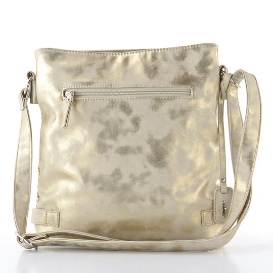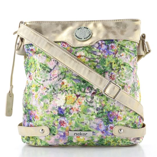 Módní a trendová kabelka od značky Rieker přináší do vašeho šatníku jedinečný styl. Její výrazné barevné provedení v béžové s metalickým leskem a pestrými vzory, jako jsou zelená, fialová, růžová, smetanová a žlutá, zaručuje, že na sebe upoutáte pozornost. Praktický a prostorný střih je ideální pro každodenní nošení. Kabelka je vyrobena z hladké metalické syntetiky a textilie s výšivkou a flitry, což jí dodává na atraktivitě.