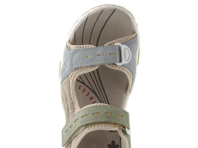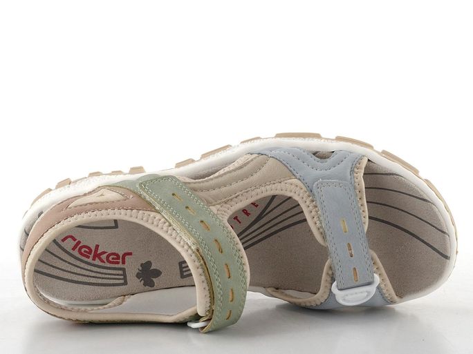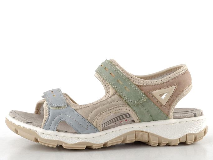 Sportovní sandály Rieker 68866-94 jsou ideální volbou pro všechny ženy, které hledají pohodlnou a stylovou obuv na jaro a léto. Jejich sportovní střih a kombinace matné a hladké syntetiky s měkkou textilií zajišťují maximální komfort i během celodenního nošení. Příjemná barevná kombinace světle modré, mátově zelené a béžové barvy dodává těmto sandálům svěží vzhled, který se hodí do města i na letní procházky přírodou.
