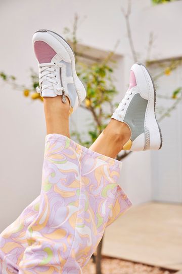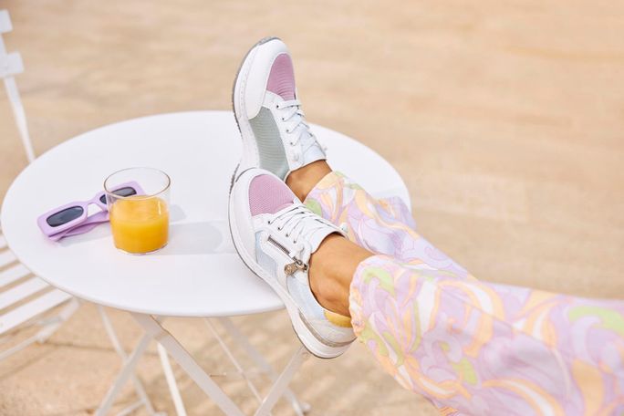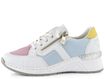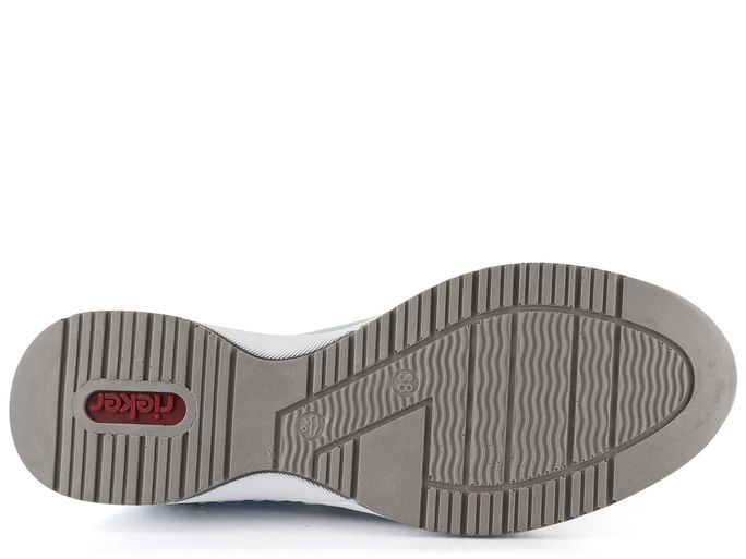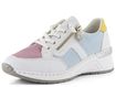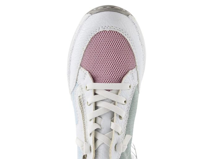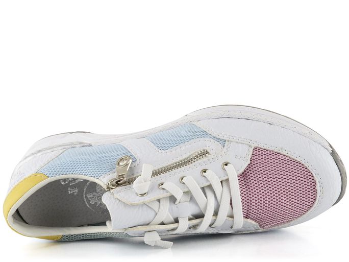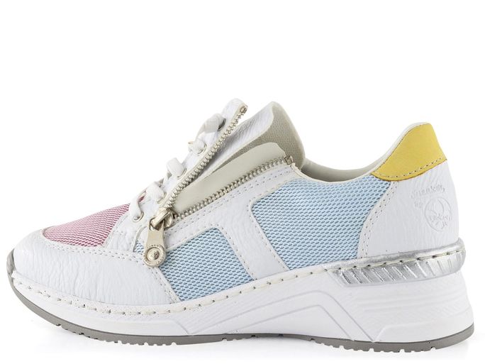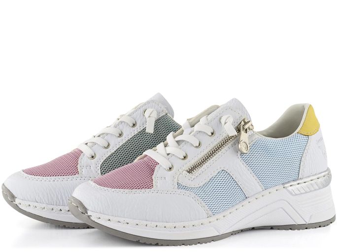 Vychutnejte si pohodlí a styl s dámskými teniskami na klínku od značky Rieker. Tyto tenisky kombinují sportovnější střih s elegantním designem, který se hodí do města i na lehké procházky. Svršek je vyroben z kombinace strukturované syntetiky a prodyšné textilie, což zajišťuje dlouhou životnost a komfort. Základní bílá barva je doplněna pastelovými tóny modré, žluté, růžové a zelené, což dodává botám svěží a moderní vzhled.