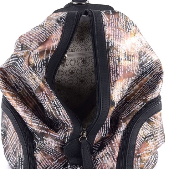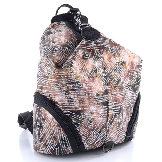 Stylový batoh od značky Rieker vyniká svým moderním sportovním střihem a originálním potiskem. Tento trendový kousek je vyroben z hladké a poddajné syntetiky, která zaručuje dlouhou životnost a komfort při nošení. Batoh má metalický podklad v bronzovo-měděné barvě s potiskem novinových útržků v angličtině, což mu dodává jedinečný vzhled.