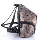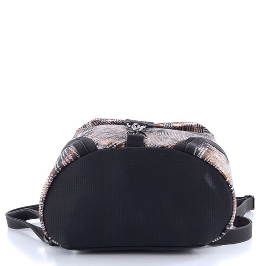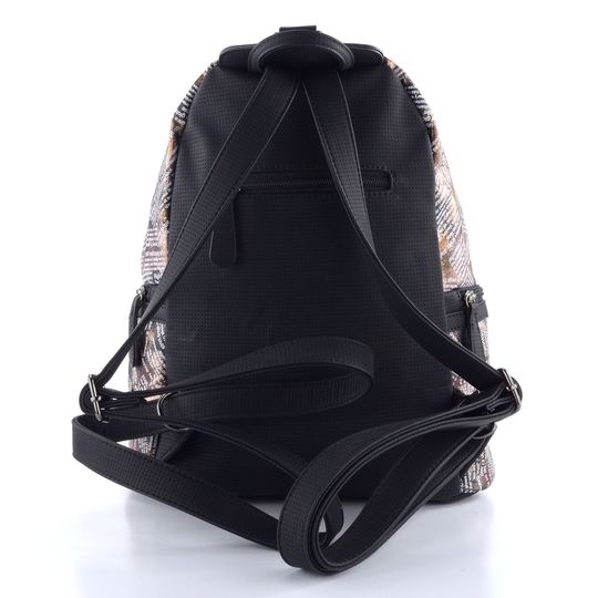 Praktické prvky zahrnují karabinku, kterou lze zapnout dole nebo nahoře, čímž se mění tvar batohu, a dvě boční zipové kapsičky. Zadní strana, dno, popruhy a lemy jsou v kontrastní černé barvě. Batoh se uzavírá na svislý zip a má délkově stavitelné ramenní popruhy a poutko na zavěšení.
