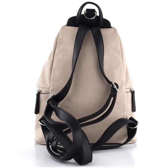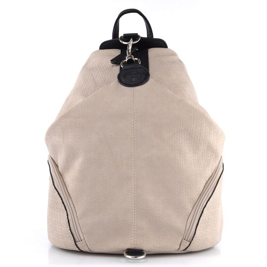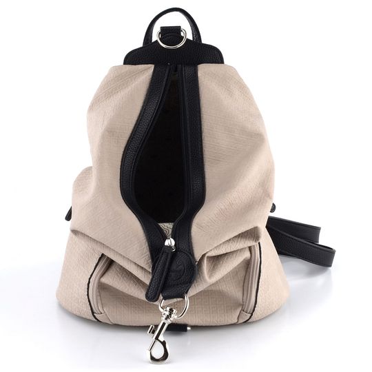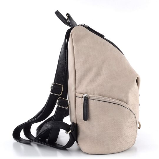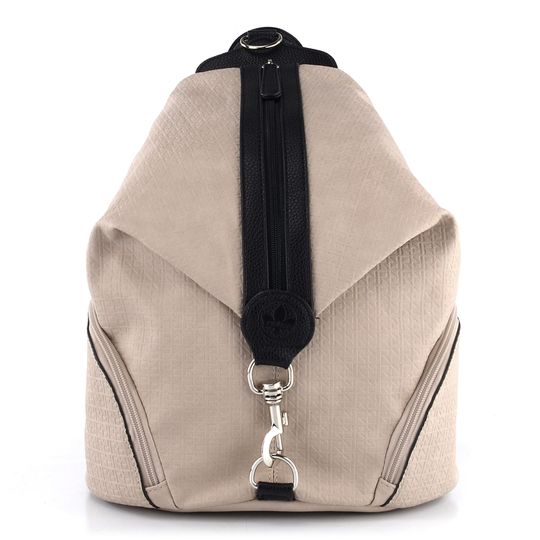 Módní stylový batoh v béžové barvě s podélným zipem a se dvěma kapsičkami na straně.