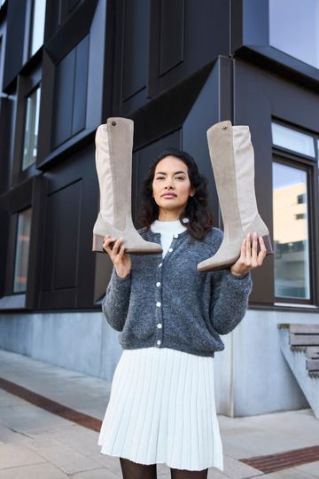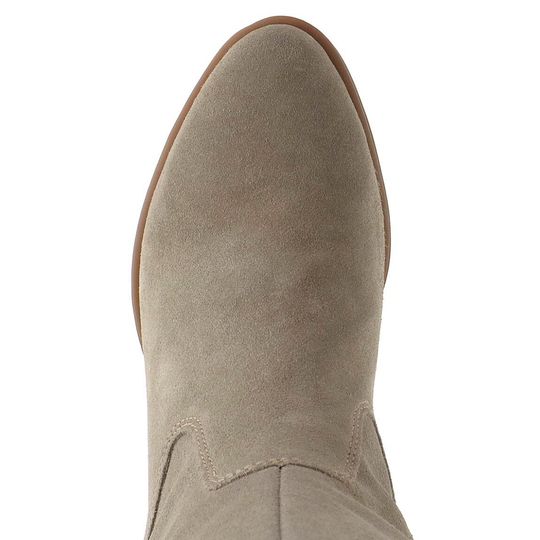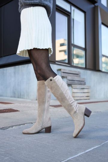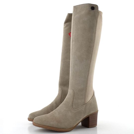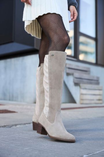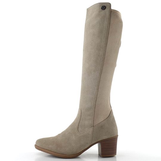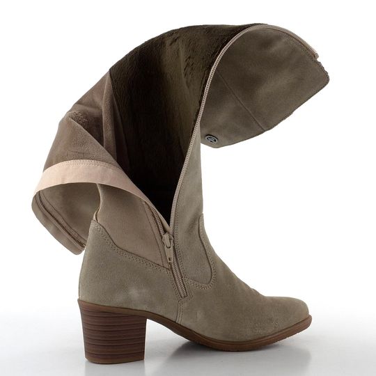 Dámské semišové kozačky s pružnou lýtkovou částí, teplou podšívkou a pohodlným širokým podpatkem.