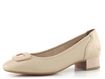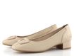 Širší dámské lodičky z hladké kůže v béžové barvě, s ozdobnou sponou na špičce a nízkým podpatkem.