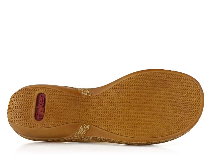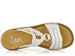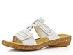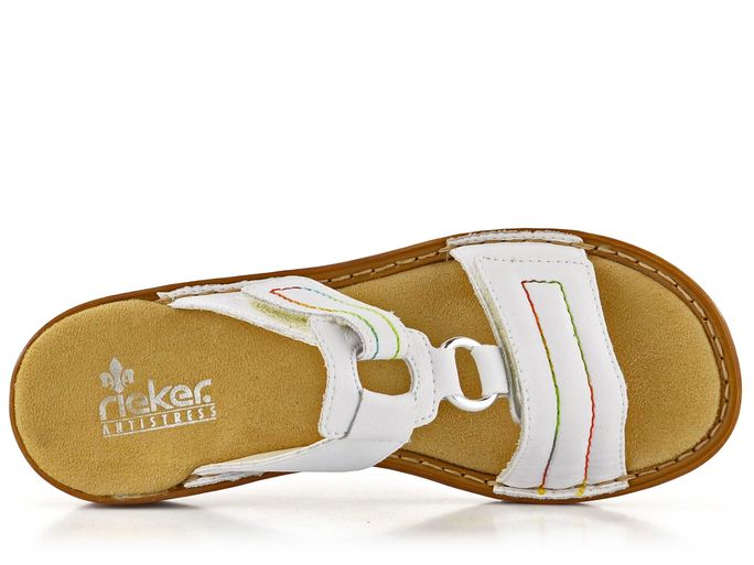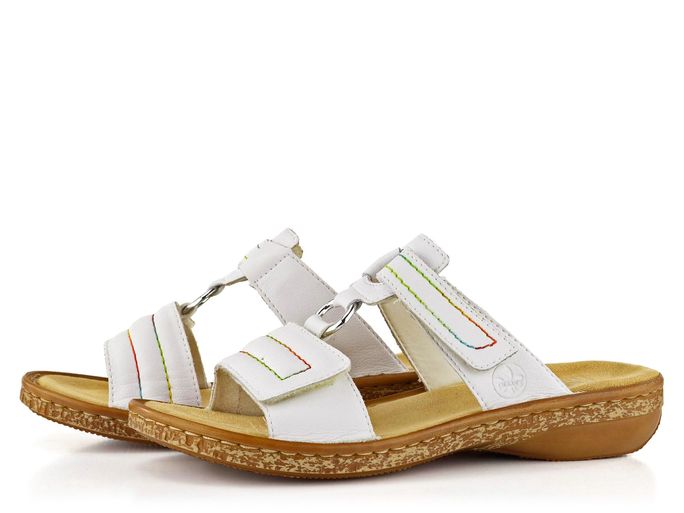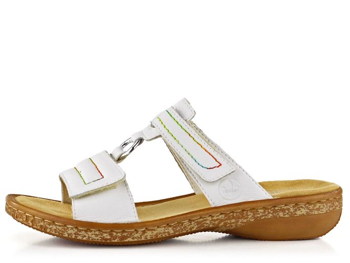 Dámské pantofle značky Rieker v elegantní bílé barvě jsou ideální volbou pro jarní a letní sezónu. Tyto pantofle se mohou pochlubit prostorným střihem s kulatou špičkou, což zajišťuje maximální pohodlí při nošení. Svršek je vyroben z kvalitní hladké kůže s povrchovou úpravou, která dodává botám sofistikovaný vzhled. Ozdobné prošití nití v duhových barvách a kovový kroužek spojující přední a nártový pásek přidávají pantoflím na originalitě.